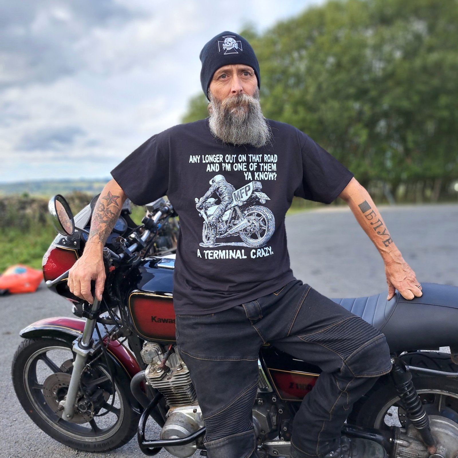 Step into the post-apocalyptic world of Mad Max with this striking t-shirt inspired by Goose, one of the film’s most legendary characters. Featuring detailed artwork of the MFP Kawasaki Z1000 and Goose’s unforgettable quote — “Any longer out on that road and I’m one of them, ya know? A Terminal Crazy.” — this shirt captures the raw energy of the cult classic.