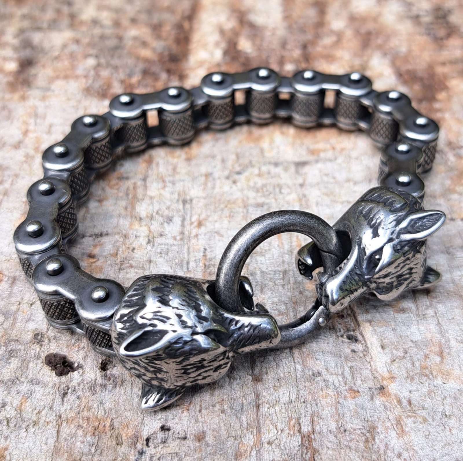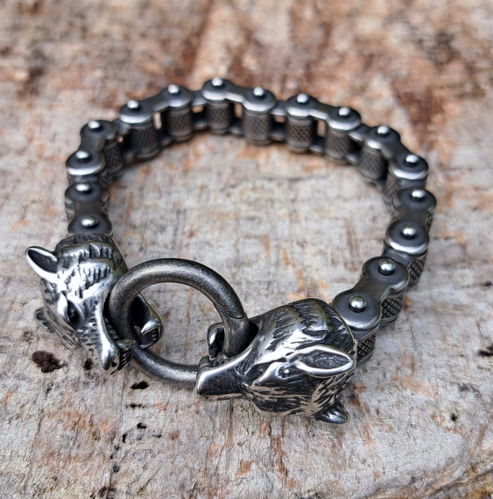 • Design: Twin wolf heads clasping a central ring with biker chain links